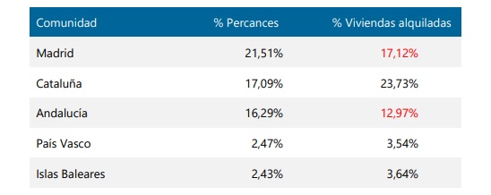 Percances del seguro de alquiler y viviendas alquiladas, por comunidades autónomas. | Gráfico: Estamos Seguros.