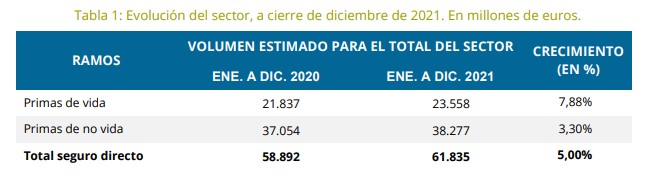 Evolución del sector, a cierre de diciembre de 2021. Tabla: UNESPA.