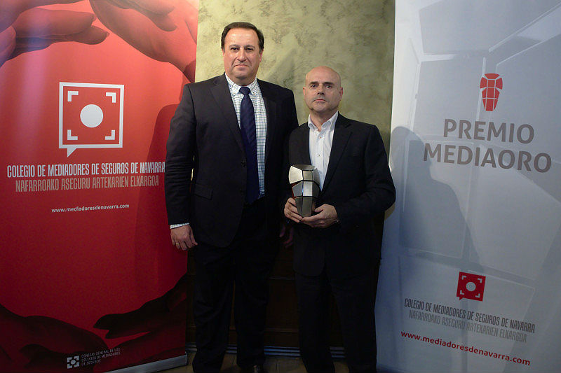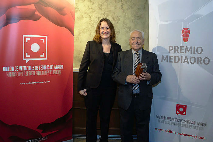 Más de ochenta personas asistieron este jueves 4 de febrero a la entrega del Premio Mediaoro 2015, galardón que otorga el Colegio de Mediadores de Seguros de Navarra a aquellas personas vinculadas al sector que han destacado por su labor profesional. Representantes del Gobierno foral, colegiados y miembros de compañías aseguradoras, entre otros, acudieron a esta cita anual donde se premió a Pello Echarri, coordinador del área técnica de empresa de Mapfre, por su compromiso con la mediación. Además, se concedió una mención especial a Carmelo Eraso, que lleva colegiado desde hace 40 años.